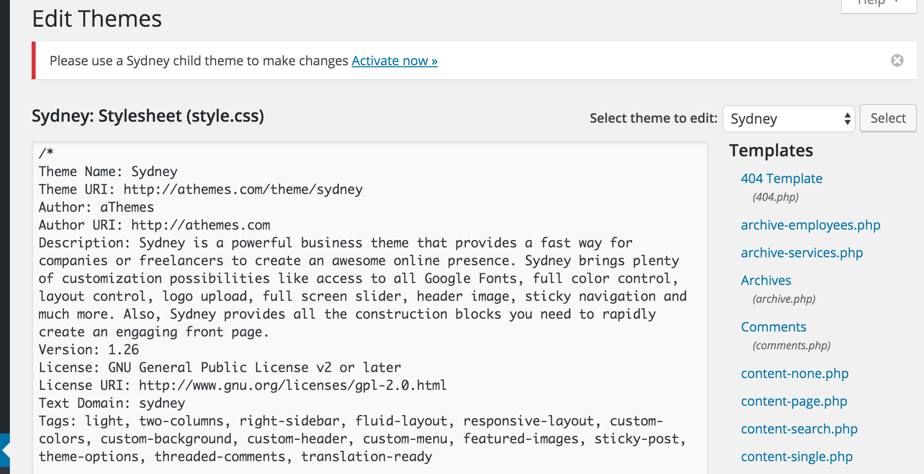 - If a child theme is not active, the user will see a WP notice with an "Activate" link on the Theme Editor screen