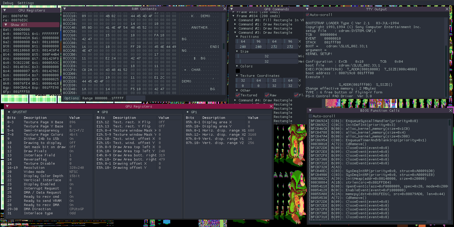 - CPU, with a fairly accurate MIPS I interpreter